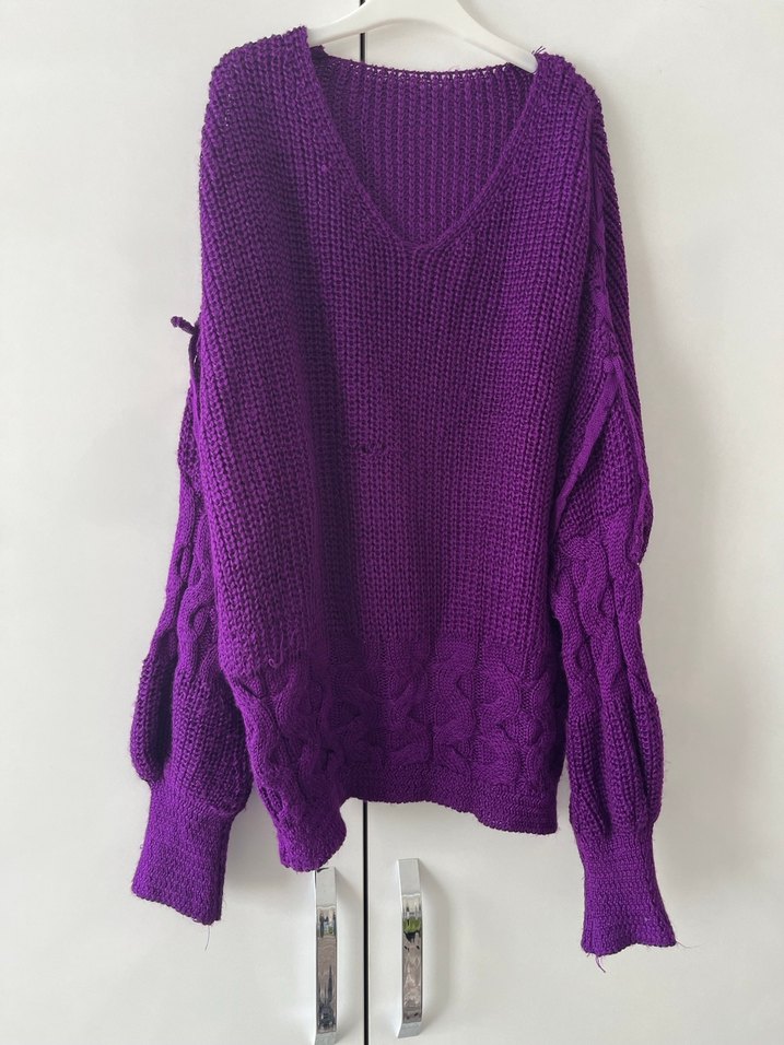 Mor renkli, bol kesim V yaka kadın kazak. Uzun kollu, örgü dokusu ve bohem tarzıyla günlük kullanım için uygun. Küçük bir kusuru var görselde görünüyor onun dışında bir sorun yoktur.