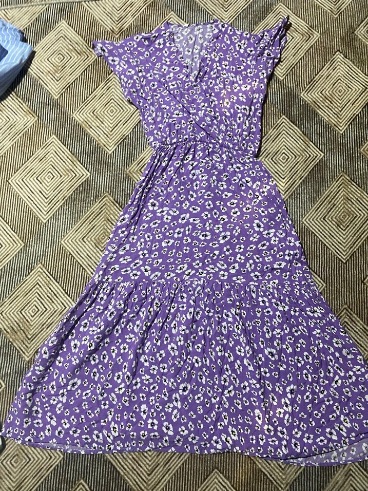 Bu uzun mor elbise, renkli batik desenli, bol kesim ve drapeli tasarıma sahiptir. Askılı kolları ve V yakası ile bohem tarzını yansıtır.
