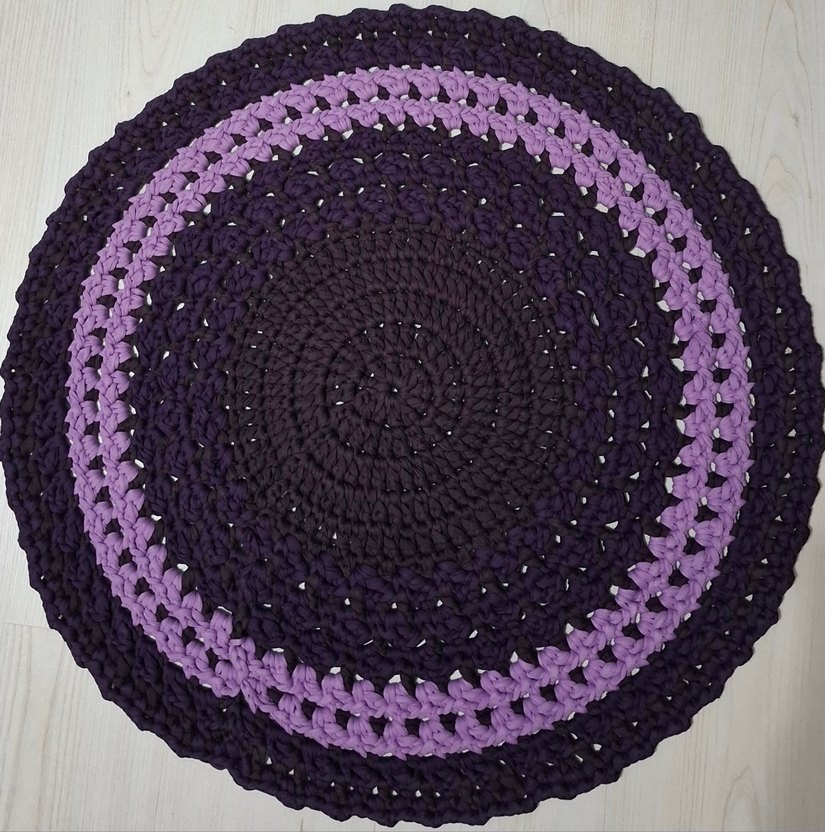 Morun koyu tonlarında, bohem tarzda, yuvarlak ve örgü dokulu bir halı. 75×75cm