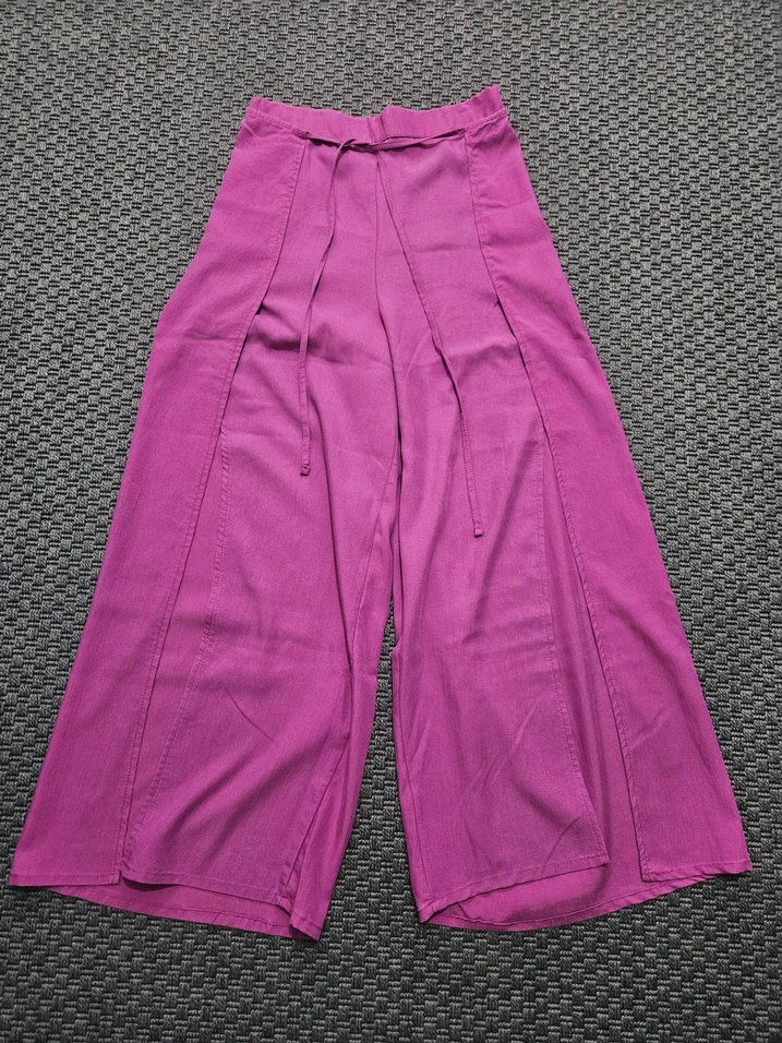 Mor renk, Viskoz kumaştan, bol kesim, önden yırtmaçlı ve uzun boy pantolon, kemerli bel detayıyla günlük renkli bohem tarzına uygun.