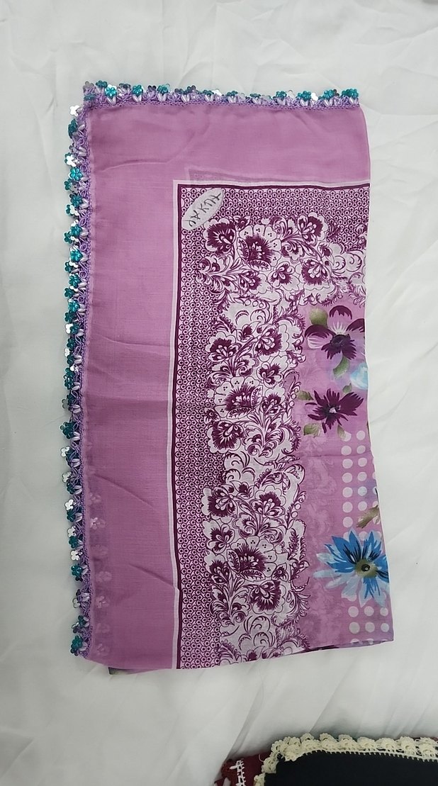 Mor renkte, dantel detaylı ve renkli çiçek desenli kadın şalı. Bohem ve retro tarzını yansıtan yumuşak dokulu kumaştan üretilmiştir.