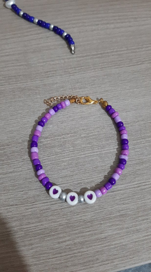 Mor tonlarda kalp desenli boncuklarla renkli bohem tarzda günlük kullanıma uygun bileklik.