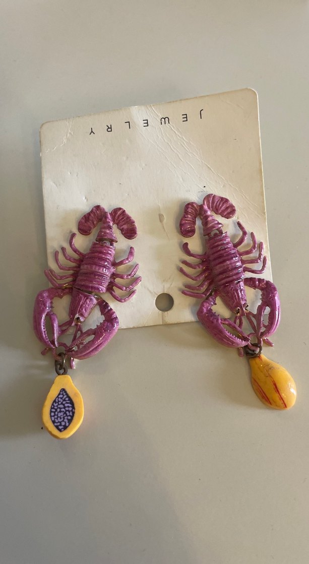 Kısa mor küpeler, ıstakoz şeklinde, renkli boncuk ve nakış detaylı, romantik akşamlar için uygun.
