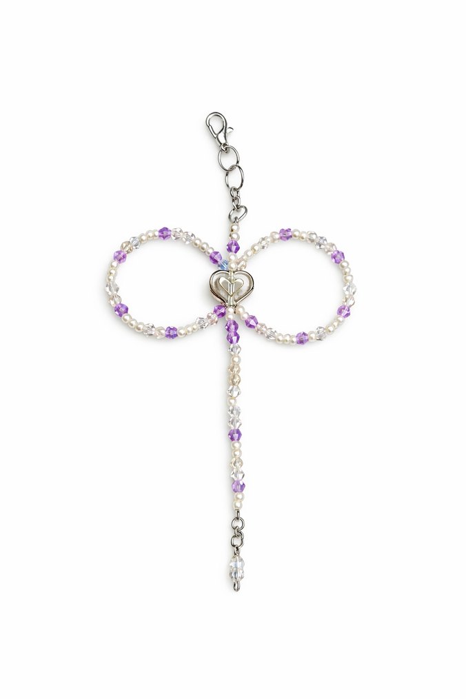 Mor boncuklar ve kalp detayıyla bohem tarzda kadın anahtarlık, minimalist ve renkli bir görünüm sunar.