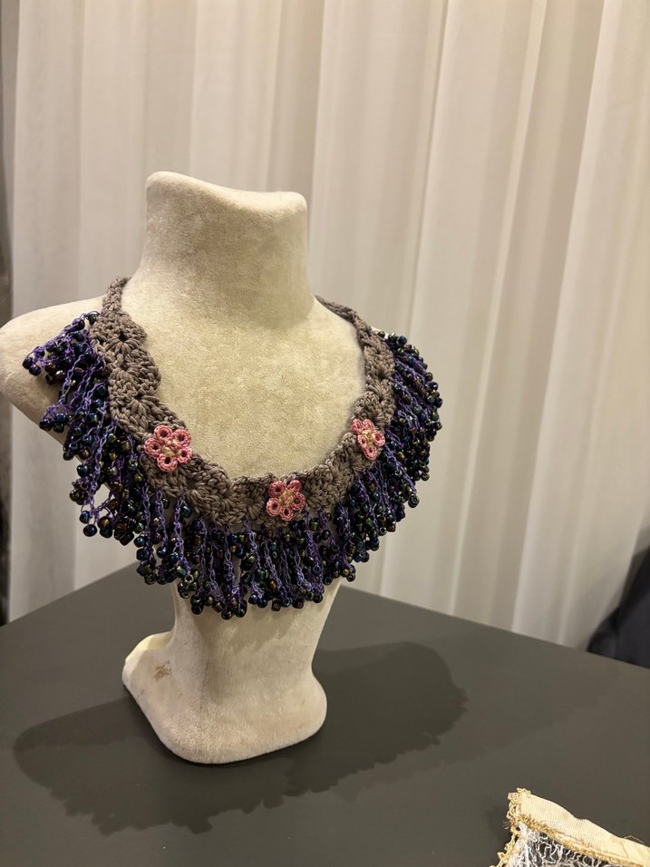Koyu mor boncuklar ve nakışlı çiçek detaylarıyla bohem tarzda kısa kolye, günlük kullanıma uygun. İğne oyası, boncuk ve doğal taş ile tasarlanmıştır. El yapımıdır. Bir kadın girişimciye destek için satıyorum.