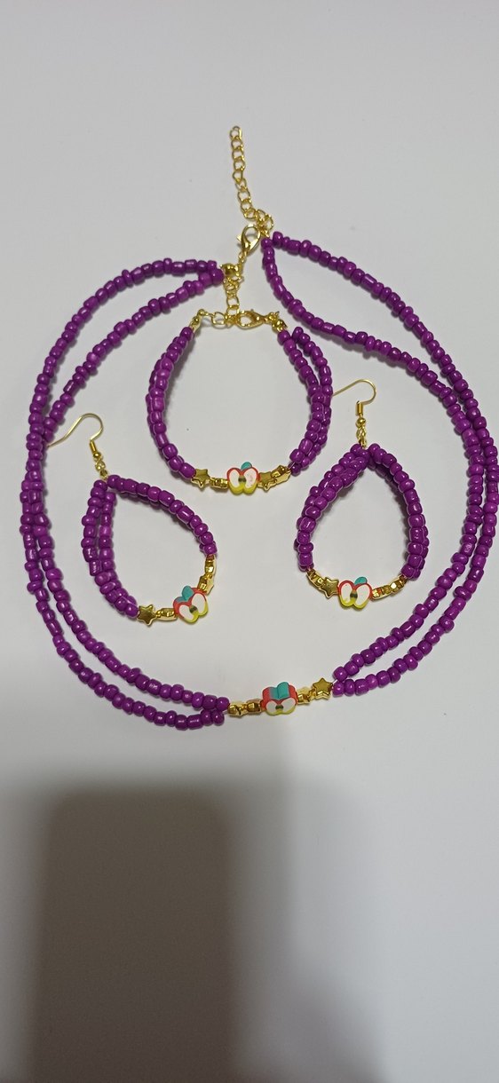 Mor boncuklardan yapılmış uzun kolye, bileklik ve küpe seti, renkli işlemeli çiçek desenleriyle bohem tarzda günlük kullanıma uygun.farklı renkler mevcuttur satın almadan önce yorumlarda belirtiniz