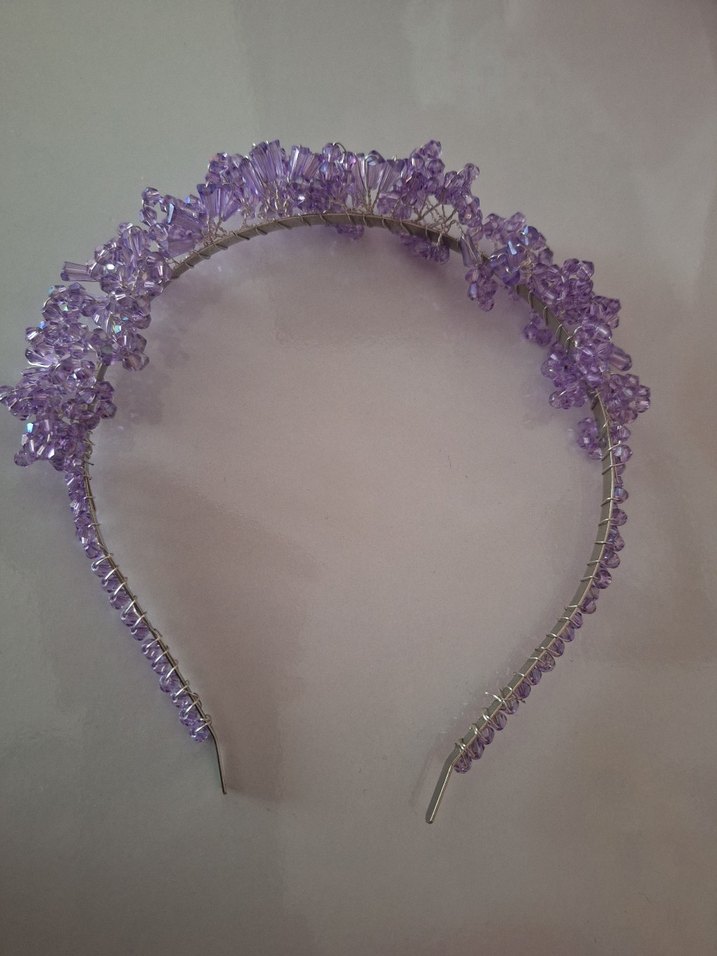 Mor cam boncuklarla süslenmiş bu pastel taç, trend belirleyiciler için gösterişli ve yenilikçi bir tarz sunar.