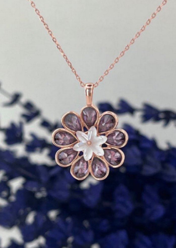 Kısa uzunlukta, boncuklu mor çiçek desenli modern klasik tarzda kadın kolye, günlük kullanım için uygundur. 925 ayar gümüş