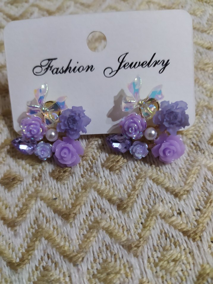 Pastel mor tonlarında, boncuklu çiçek desenli, inci detaylı kısa uzunlukta, bohem tarzda şık küpeler.