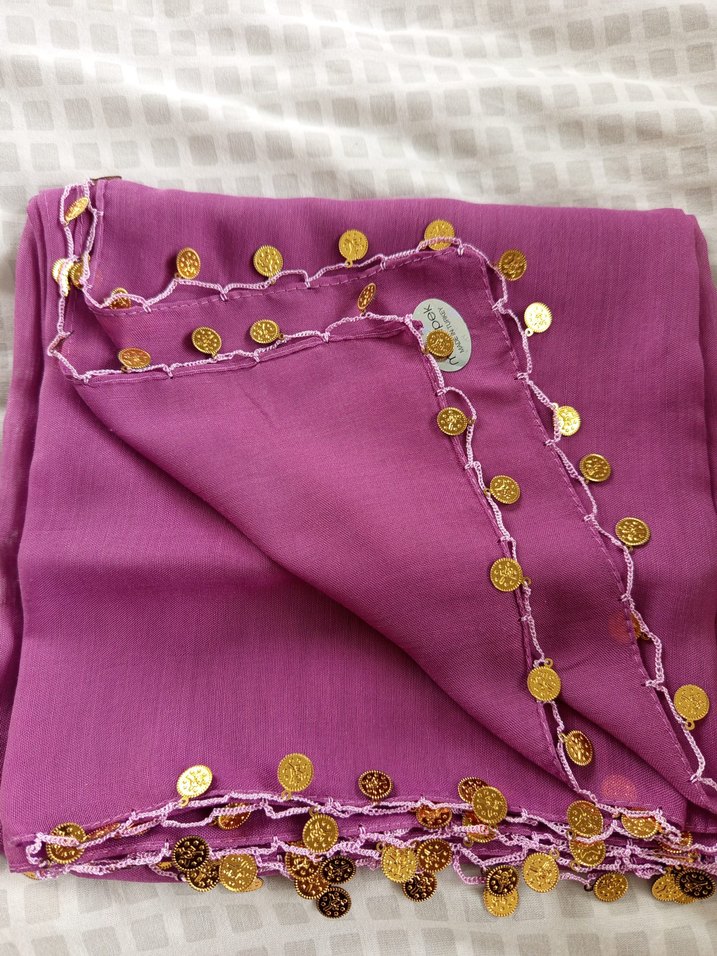 Mor renkli, kenarları parlak altın boncuklarla süslenmiş ipeksi görünümlü yazma ✨
