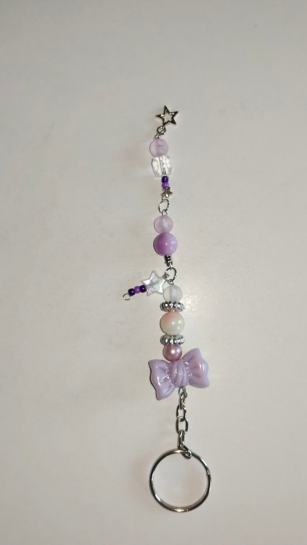 Bu boncuklu anahtarlık, pastel mor tonlarda yıldız figürü ve fiyonk detayıyla bohem ve retro tarzı yansıtıyor. ✨