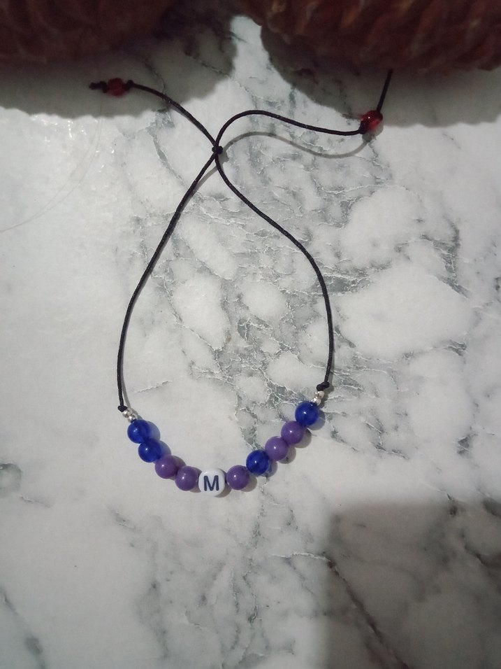 Mor tonlarında boncuklarla yapılmış, M harfi detaylı minimalist bileklik. Günlük goth ve bohem tarzlara uygundur.