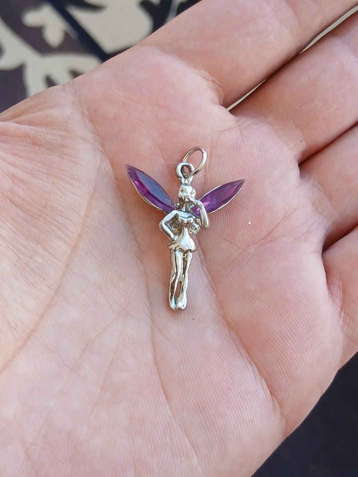 Mor boncuklu detaylara sahip, minimalist peri figürlü kadın charm. Bohem ve retro tarzlara uygun, günlük kullanım için ideal. ♀️