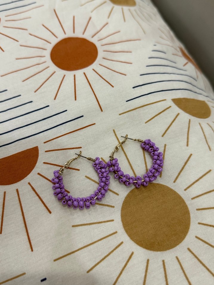 Mor boncuklarla işlenmiş, renkli ve kısa boylu bohem tarzda günlük kullanıma uygun küpeler.