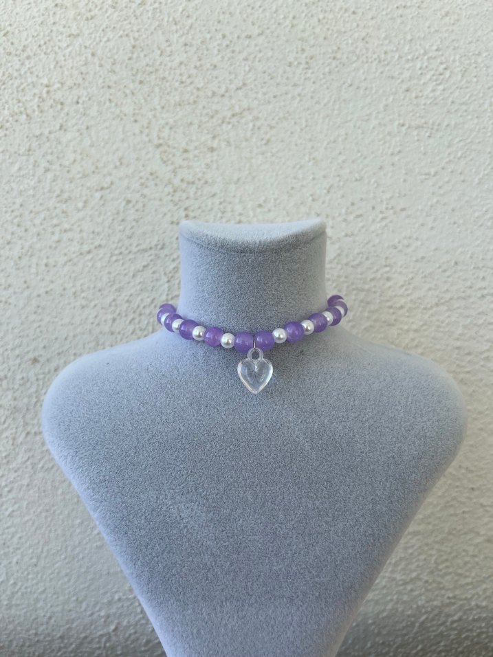 Mor boncuklu, kısa boyda, şeffaf kalp kolye ucu olan pastel tonlarda tie-dye desenli kadın bileklik . Minimalist, bohem ve gotik tarzlara uygun, günlük kullanım için.