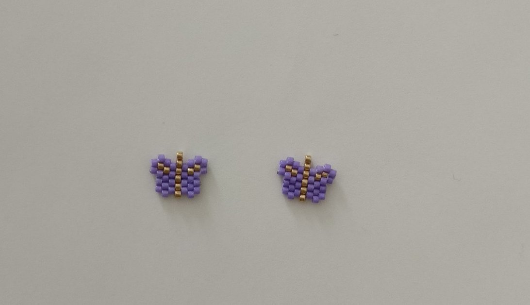Mor ve altın tonlarında boncuklarla işlenmiş mini kelebek şeklinde kısa küpeler, sade ve bohem tarzı sevenler için günlük kullanıma uygun. farklı renk seçenekleri mevcuttur