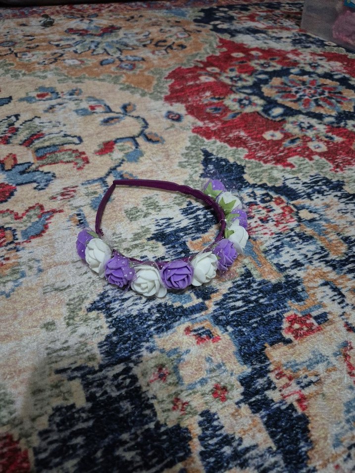 Mor örgü malzemeden yapılmış, beyaz ve mor boncuklu çiçeklerle süslenmiş bohem tarzda saç Tacı