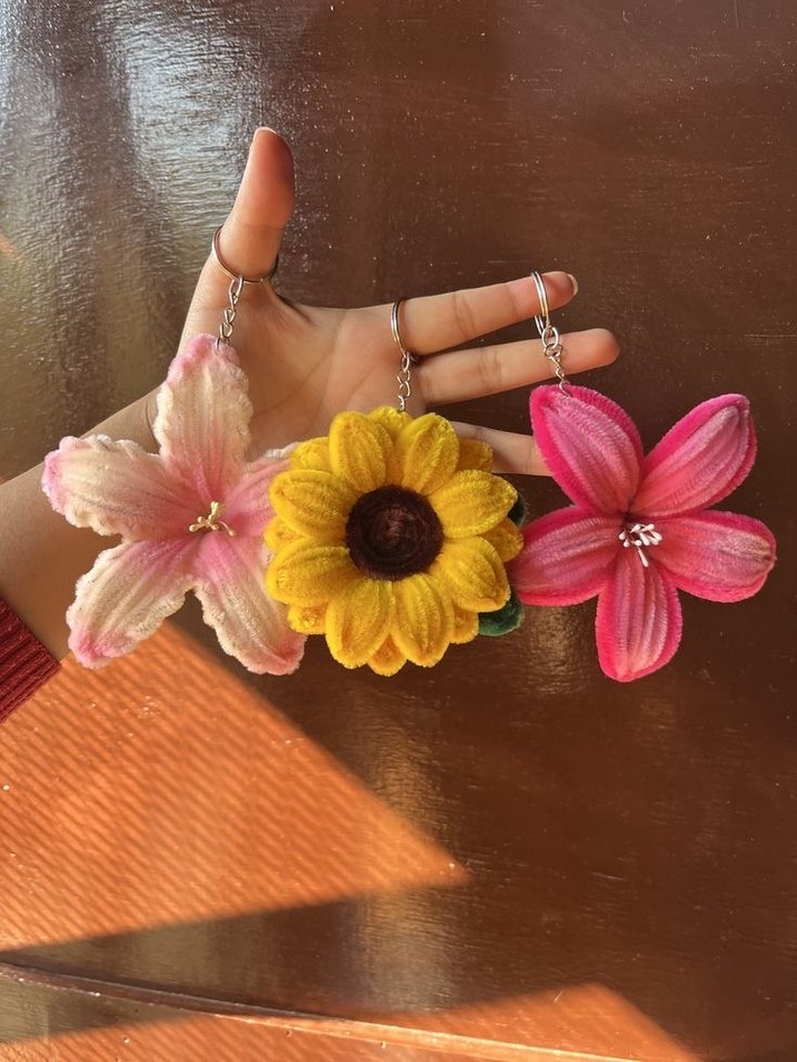 Mor peluş anahtarlık, pastel mavi kenarlarla, boncuk ve pembe tüylü çiçek detayıyla rahat, bohem sokak stilini yansıtıyor.