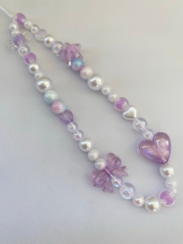 Mor pastel tonlarda boncuklu, kelebek ve kalp figürlü, bohem tarzı çocuk kolyesi.