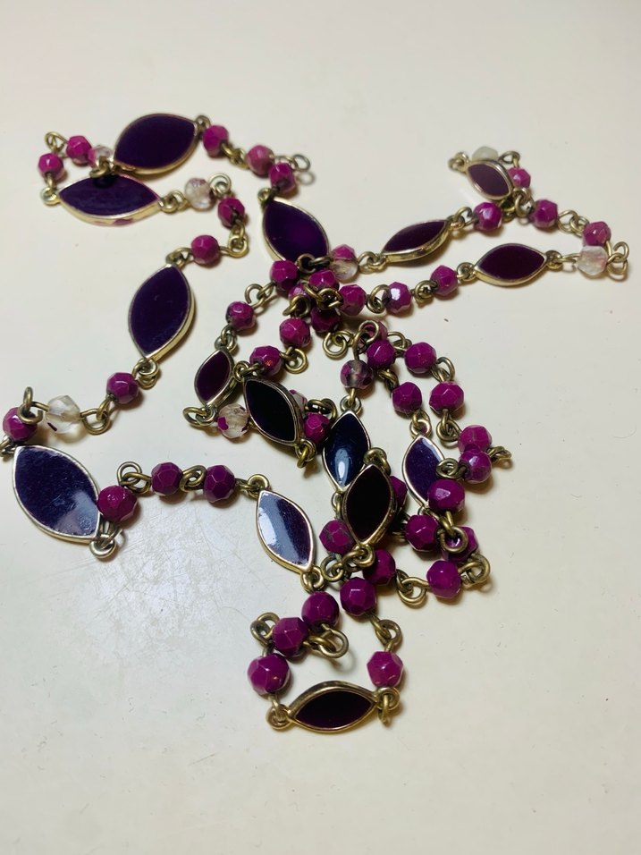 Koyu mor boncuklar ve desenli detaylarla uzun bohem tarzda kolye, günlük kullanıma uygun.
