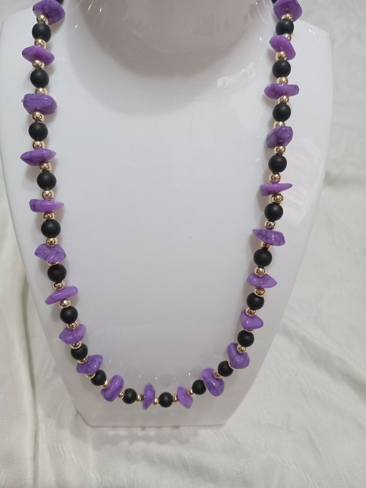 Mor ve siyah boncuklardan oluşan, bağlama desenli uzun kolye, minimalist goth tarzıyla günlük kullanıma uygundur.