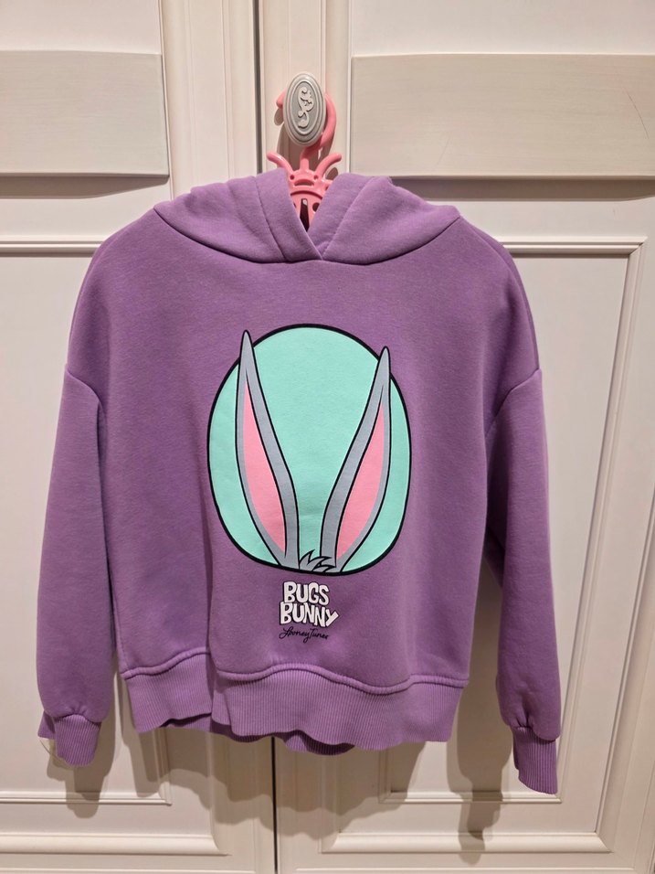 Pastel mor renkte, kapüşonlu ve uzun kollu, bol kesim sweatshirt. Yumuşak kumaştan, Bugs Bunny baskılı ve düğmeli detaylı. Trendy günlük kullanım için uygun. Mavinin ürünü az kullanılmış hiçbir deformasyon yok 4 5 yas uyumlu