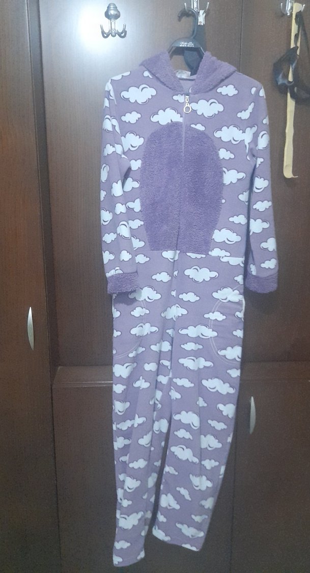 Mor pastel renkte, bulut desenli bol kesim hamile pijama takımı. Uzun kollu, yuvarlak yakalı ve ön fermuarlı, rahat ve konforlu.