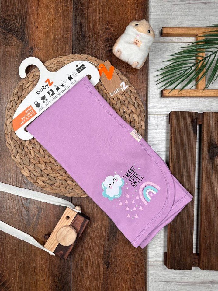 Sıfır ve etiketli üründür Pamuk Bulut Desenli Kız Bebek Battaniye Yumuşak ve sıcak kumaştan yapılmış pastel mor bebek battaniyesi, üzerinde "I want your smile" yazılı sevimli bulut ve gökkuşağı baskısı bulunur.