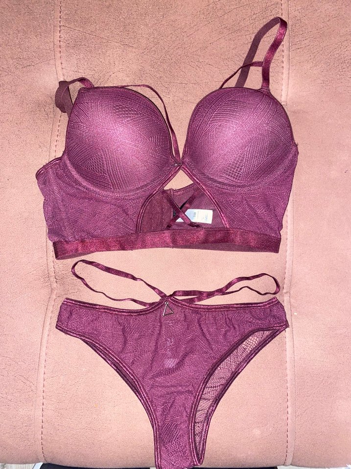 Koyu mor renkte, gotik tarzda midi uzunlukta, desen içermeyen ve zarif askı detaylarına sahip bir sütyen. Parlak ve iddialı bir görünüm sunar. 1-2 kez kullanıldı hafif destekli alt slip