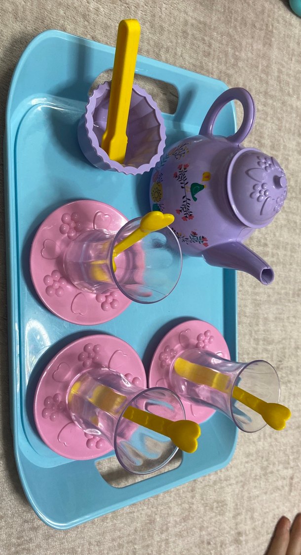 Pastel mor renkli oyuncak çay seti, üzerinde üç bardak sarı kaşık ve pembe tabaklar ile birlikte mavi tepsi üzerinde yer alır. ☕