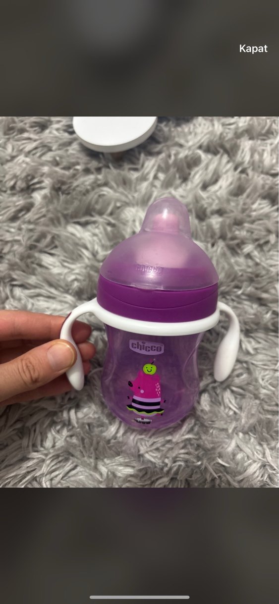 Kulplu ve renkli tasarımlı mor Chicco bebek biberonu. Tutması kolay ve besleme için uygun.