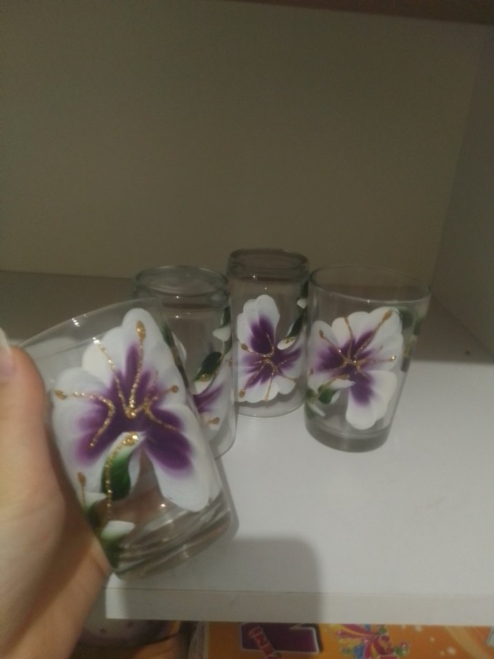 Dört adet cam bardak, koyu mor çiçek ve yeşil yaprak desenleriyle süslenmiştir. Her bardakta altın detaylı çiçek motifi bulunur.