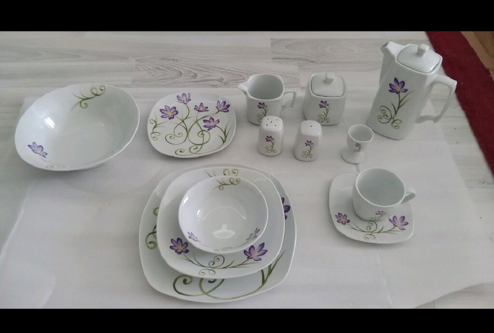 Mor çiçek desenli seramik yemek takımı. Tabak, kase ve baharatlıklar içerir. ️48 parça sıfır kesinlikle kullanılmamış kutusunudadır