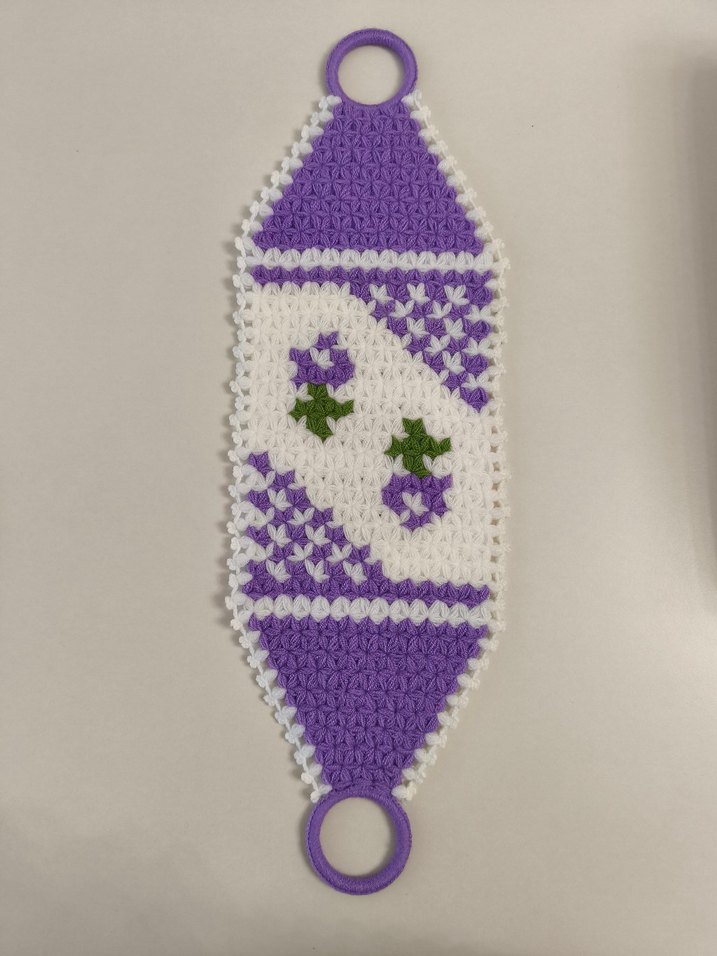 Mor ve beyaz renklerde çiçek desenli, iki tutma halkalı örgü banyo lifi