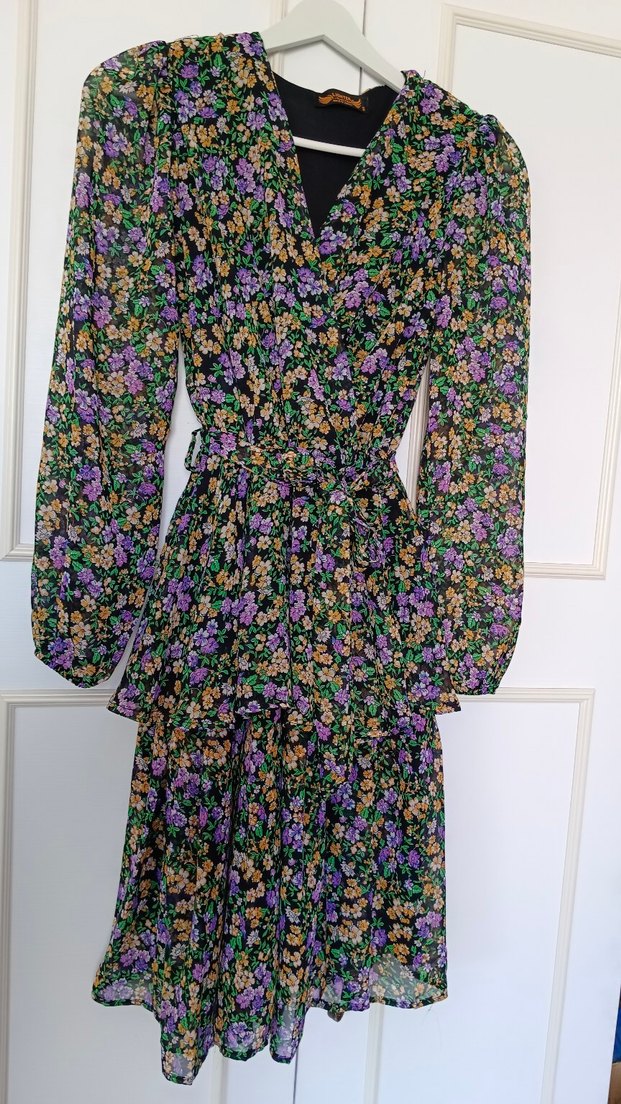 Mor çiçek desenli, V yaka, fırfırlı, bol kesim uzun elbise. Yumuşak sentetik kumaştan S beden, astarlıdır, kendi deseninden kemerli, V yaka elbise. Yenidir 1 kez giyildi, çok şık tatlı bir elbise. Kol ucu lastikli. Bel bölgesi lastiklidir.