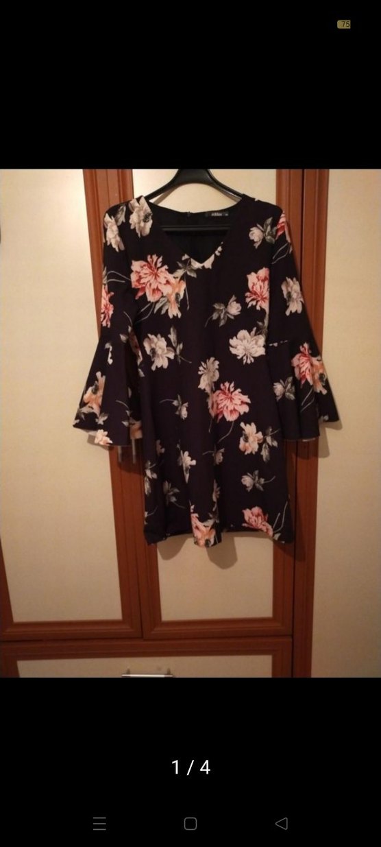 Mor renkli, çiçek desenli mini elbise, bol kesim ve uzun kollu. Volan detayları ve V yaka ile bohem tarzını yansıtıyor.