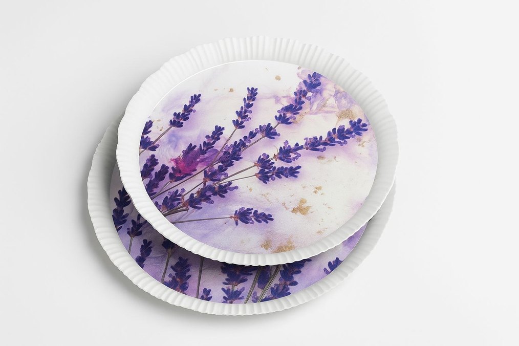 Bohem tarzda, pastel mor çiçek desenli, lavanta figürlü beyaz tabak seti.