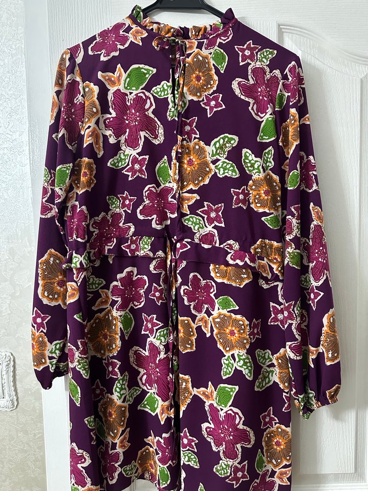 Mor çiçek desenli, belden bağlamalı, uzun kollu, yüksek yakalı bol kesim tunik elbise . Yumuşak tekstil kumaştan, günlük kullanıma uygun.
