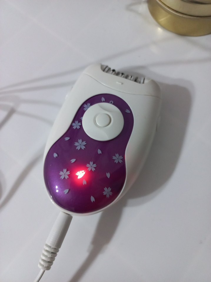 Mor renkli, çiçek desenli ve tek düğmeli kullanımı kolay epilatör. Kompakt yapısıyla tüy alma işlemini pratik hale getirir.