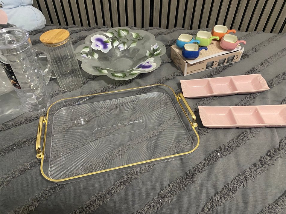 Mor Çiçek Desenli Gri Tabak ve Cam Sunum Seti