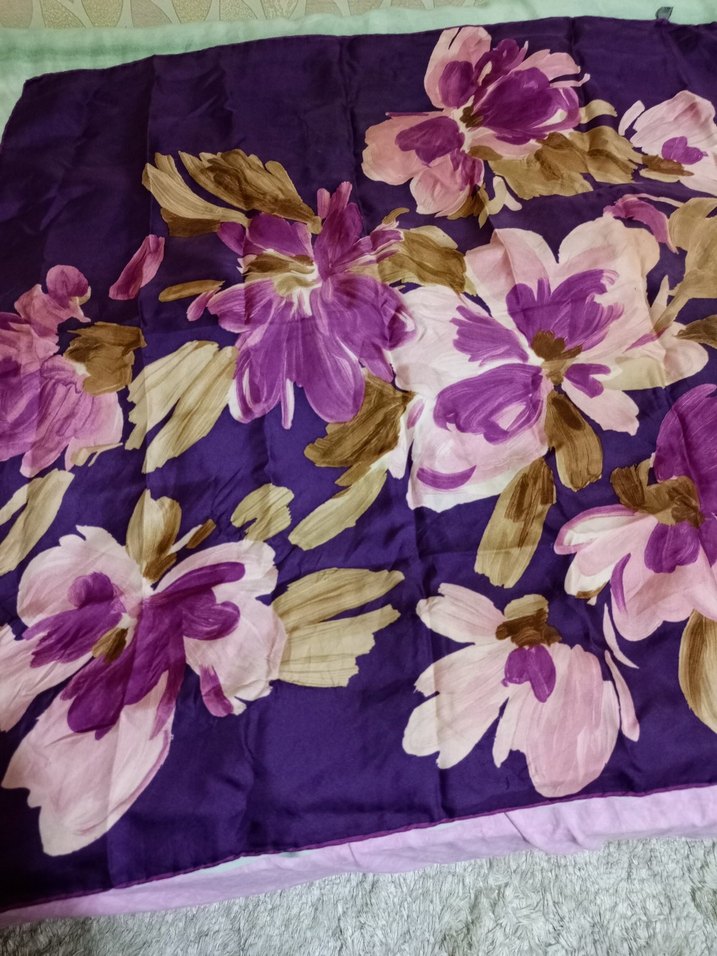 Koyu mor renkte, büyük pembe ve kahverengi çiçek desenli, sentetik kumaştan drapeli kadın fular. Bohem ve retro tarzlara uygundur. ürün ün bir kenarında yırtık vardır onun dışında deformasyon yoktur