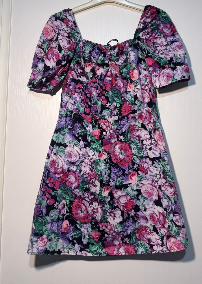 Mor çiçek desenli, kısa kollu ve fırfırlı bu midi elbise, yumuşak sentetik kumaştan yapılmıştır. Bohem tarzı ve romantik akşamlar için uygundur.
