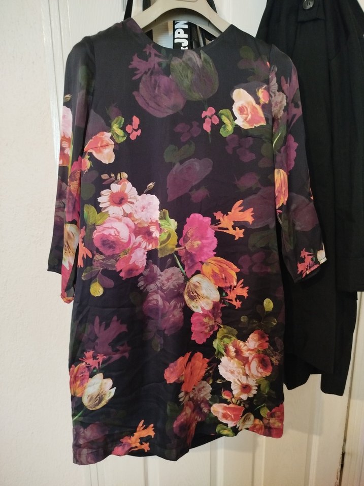 Mor renkli, çiçek desenli kadın kimono. Uzun kollu, yüksek yakalı ve dökümlü, bol kesim midi boyda. İpek gibi yumuşak kumaştan, bohem tarzda.