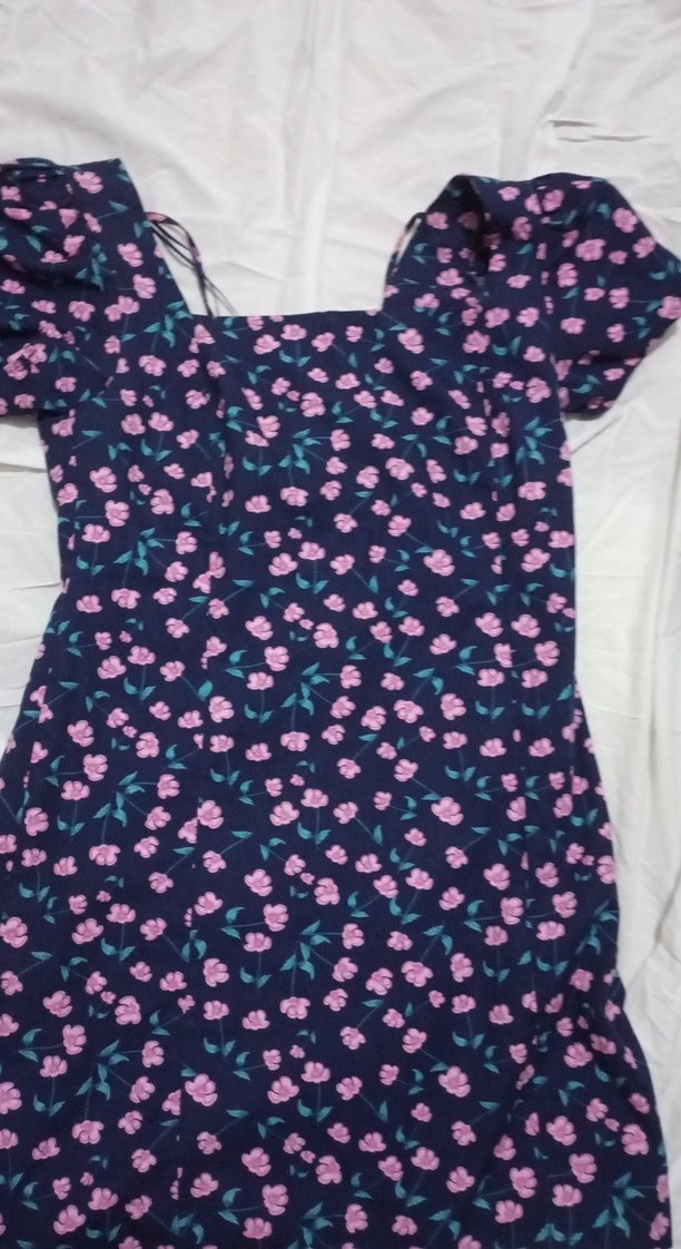 Mor çiçek desenli, V yaka ve kısa kollu, düğmeli, vücuda oturan midi elbise. Sentetik kumaştan, günlük sokak stiline uygundur.