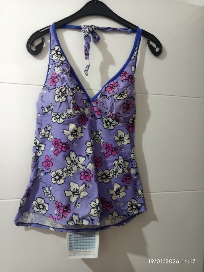Mor renkli, pastel tonlarda çiçek desenli, dantelli ve kısa kesim kadın mayo. Bohem tarzı için uygun, kol kısmı kolsuz ve vücuda oturan model.SADECE UST MAYODUR.