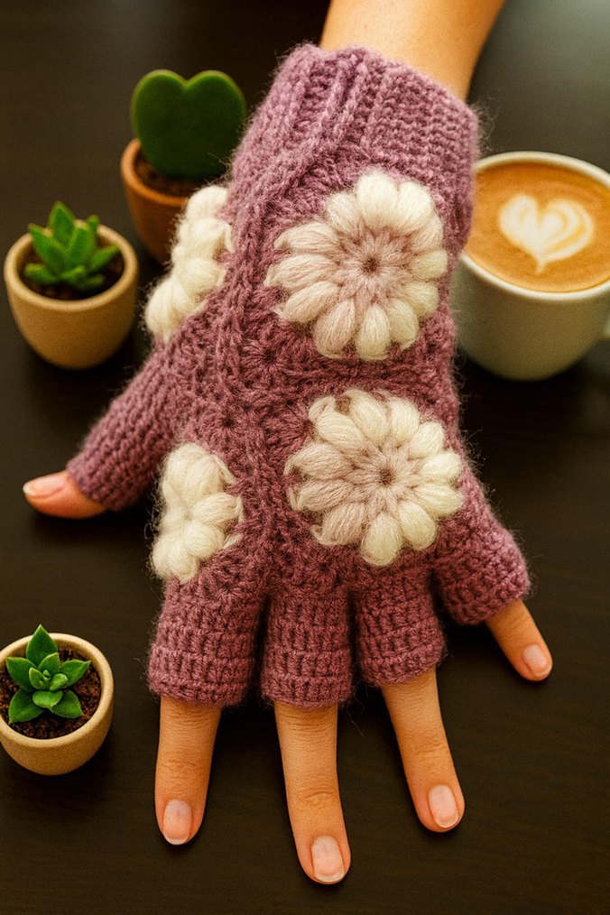 Mor renkli, beyaz çiçek desenli örgü parmaksız eldivenler, rahat ve bohem tarz için uygundur.