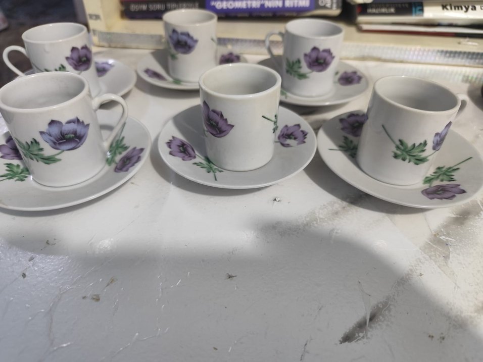 Mor Çiçek Desenli Porselen 6 lı Fincan Takımı