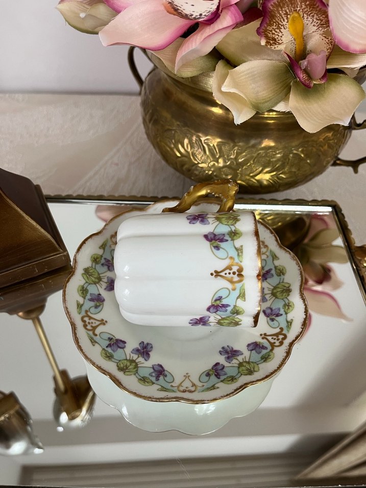 Mor çiçek desenli ve altın detaylı porselen fincan ile tabak seti, şık kahve anları için uygundur.