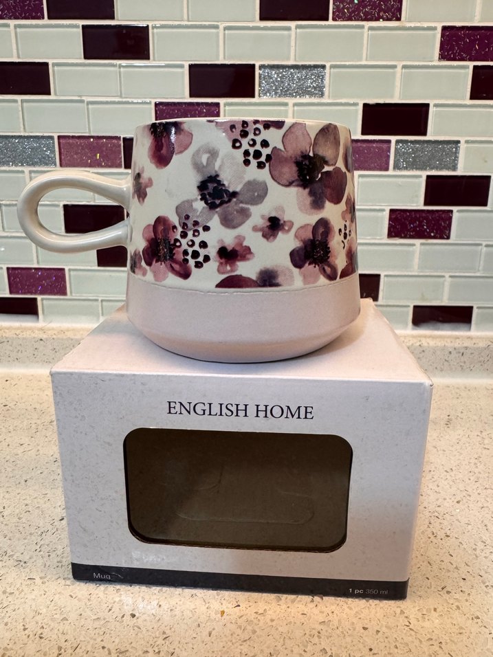 Mor çiçek desenli, gri tabanlı seramik kupa. English Home markasına ait, 270 ml hacmindedir. ☕