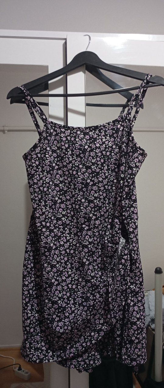 Mor çiçek desenli, askılı ve drapeli, vücuda oturan midi elbise, günlük rahat kullanım için uygundur.